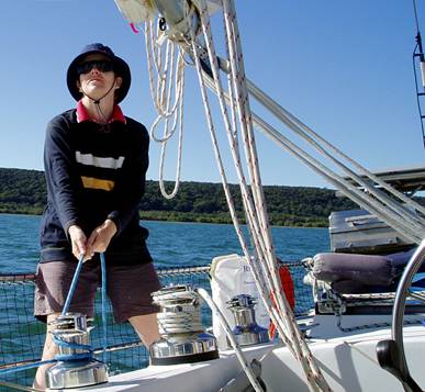 Left: Leanne raising the mainsail. Below: Shirley on the helm. Both photos by Bernd & Shirley. |