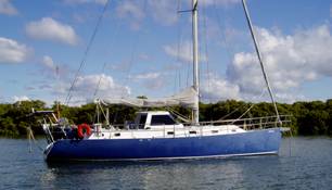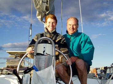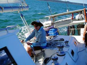 Below: Leanne & Grant on the helm, en route to Scarborough. Winter sailing on Moreton Bay—shorts, with thick jackets when it gets chilly! Photo by Bernd & Shirley. |
