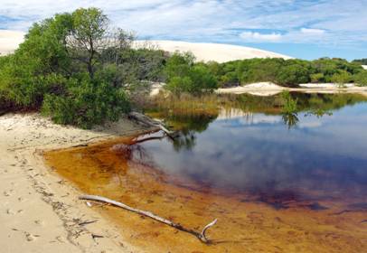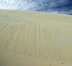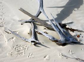 Above: lake amongst the dunes. Top right: driftwood and bird prints. Right: feather with morning dew. Below: bleached tree. |