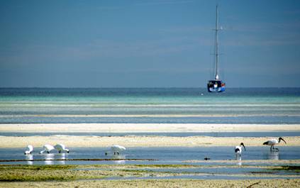 Right: Masala at anchor with Spoonbills and Ibis |