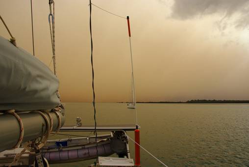 Fortunately most of the wind petered out before it got to us, but the dust was choking. Overnight, our beautiful new grey boom bag was converted to an old reddish-grey one. The fine powder covered everything. Fortunately our insect screens reduced the quantity coming inside, but in the process they had turned bright orange. As we moved about Masala’s decks, we turned orange ourselves as our clothing came in contact with the boat’s surfaces. |