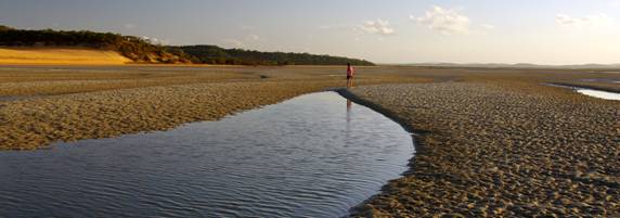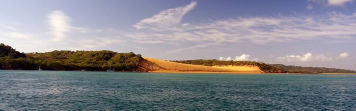 Above: the sand blow dominates the landscape at Yellow Patch. The yachts at anchor to the left of the sand show just how big it is. This shot is taken at high tide. Compare with the scene at left, showing Leanne exploring the sand flats at low tide. |