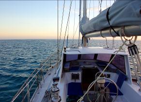 That is not to say the anchorage is always comfortable, as you will see on the next page. When high spring tides coincide with strong winds from any direction, considerable wave action comes over the reef. And since the lagoon is so large, there is plenty of “fetch” to allow waves to build up. Consequently, sometimes it can get very rough. The one saving grace is that because there is no current inside the lagoon, the vessel always sits head to wind and therefore pitches, but at least it doesn’t sit side on and roll, which is much worse. Masala’s long waterline length means at any one time she is spread across several waves so she moves only a little, and her 14 tons laden does the rest. Comfy! |