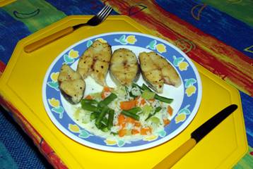Right: Spanish Mackerel steaks with coconut rice vegetables |