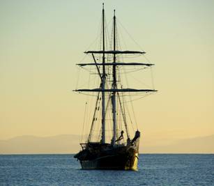 Above left: her eye may still be crooked, but at least the smile is back. Masala at anchor at Brampton Island, with Carlisle Island in the background. Above right: Solway Lass, a commercial charter yacht, at Brampton Island. |