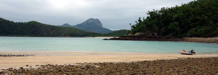 Above: Leanne and Masala at Boat Port, Lindeman Island. With threatening weather and a spring tide about to take Masala in it’s grip, we had to retreat back to Shaw Island. Below: the dramatic peak of Pentecost Island rears up above Boat Port, Lindeman Island. |