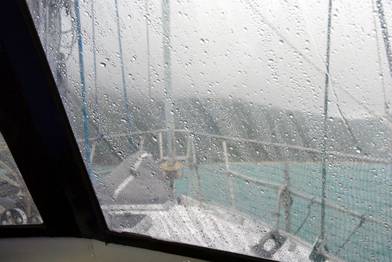 We were wondering how on earth we were going to get the dinghy up onto the davits, when for a minute Masala swung her stern away from the waves. We dragged the dinghy aft, I leapt in and attached the lifting ropes, leapt out again, and we hauled away madly, getting her up just as the next series of green humps rolled in. Phew! There was no option but to return to Shaw Island and try Lindeman again when the weather improved. This was to take another six days as first the rain then the strong 20-30 knot winds arrived. |
