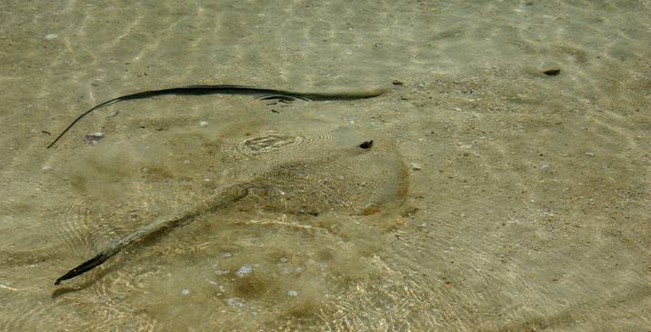 Above: spot the stingray. Head, eyes and outline of the body are to the right. The stick-like end of its tail can be seen top left. Stingrays are stealth hunters which is what makes them dangerous to humans—you don’t see them. Below: disturbed stingrays. |