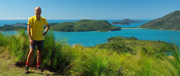 Above and Below: after waiting six days to walk to the summit of Lindeman Island, our patience is finally rewarded with a calm, clear day. Views don’t get any better than this. Shaw Island is so large that only a small part of it fits in the photo, in this case centred around an extremely narrow connecting strip of land forming Neck Bay. Can’t wipe that smile off my face. |