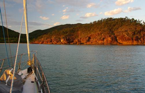 Right: sunrise on Masala at anchor in Banksia Bay. |