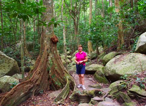 We returned to the resort and walked the Secret Garden track, which passes through lovely rainforest and tangles of moss- and lichen-covered boulders. We tried to block out the music wafting its way up from the funky cafes along the waterfront. |