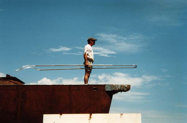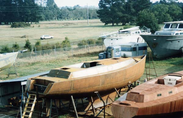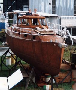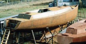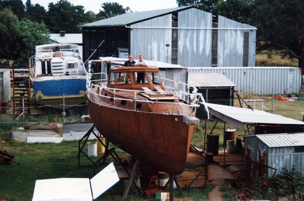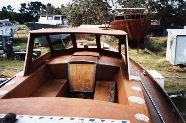 15. DECK PLATING FINISHED Left: the Radford plans do not have gas bottle compartments located on each side of the sugar scoop as shown here. Cutting the hull plates off further aft, thus decreasing the rake of the transom, allowed them to be added. Another change to the plans was to delete the lazarette in favour of a larger aft cabin. To compensate for the lost external storage, the space under the middle step in the transom was converted into two external lockers. Stainless lining of the transom edges can also be seen. |