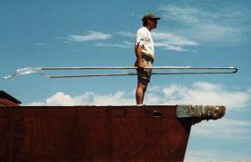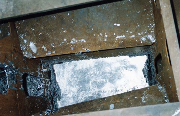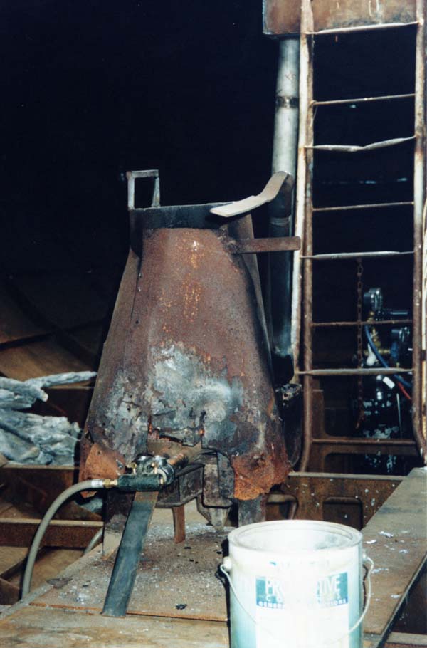 16. MELTING THE LEAD BALLAST Left: the lead smelter with flue is mounted inside the boat at the foot of a temporary companionway ladder. 17. BALLAST IN Right: this is one of the many chambers in the keel containing the solidified lead. |