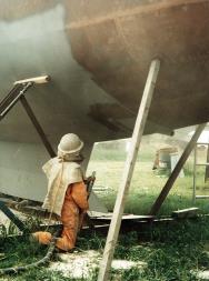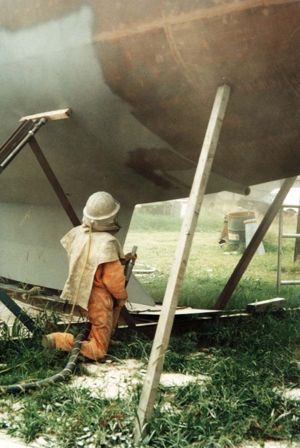 23, 24. SANDBLASTING THE HULL. Above. |