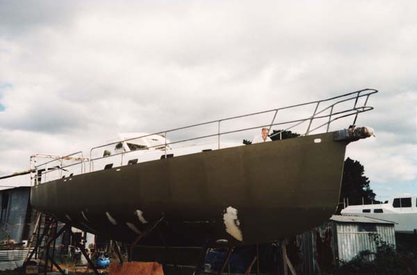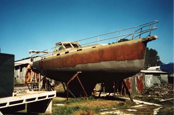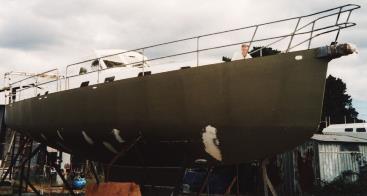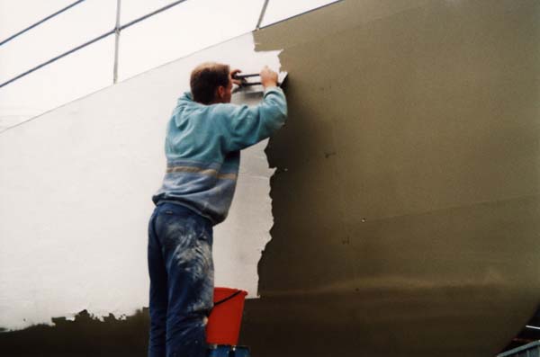 25. PRIMING THE HULL Left: after sandblasting, the hull has been sprayed with the specified thickness of two-pack epoxy Sigma EP Universal Primer (khaki-green). Below the waterline, the hull only needed spot fairing with Epoxy Fairing Compound (white) where minor irregularities exist. |