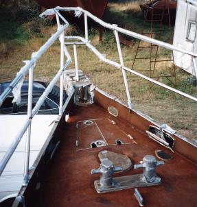 22. WELDED STAINLESS FITTINGS Left: massive hand-crafted stainless bollards are a boon to securing the vessel at anchor or on a mooring. Also visible are the anchor locker doors, the forward mooring cleats, the stainless base plate for the windlass and the chain plate for the inner forestay. All fittings are welded to the deck. Where mounting holes are required, rather than being through-drilled they are blind-drilled and tapped to eliminate leaks. Exceptions are the winches, which are through-bolted to prevent theft, given their high price. There are more than 200 blind tapped holes on the deck. It is time consuming to do this, but the only way to guarantee no leaks. All the cavities in the clutch pads and mainsheet traveller have been filled with foam to prevent water ingress and rust. |