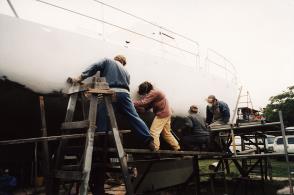 26, 27. FAIRING THE HULL ABOVE THE WATERLINE Above, left: to ensure a perfect finish, the hull is completely faired above the waterline using Epoxy Fairing Compound. It is applied by trowel. The stainless steel strip welded on top of the gunnels is being used as a fairing point. Above, right: “long boards”, otherwise known as “torture boards”, are being used to sand back the fairing compound to a smooth and even finish. Each board has four handles, allowing two people to work it. Sandpaper off a roll is cut to length and attached to the board by folding it over the ends and screwing on wooden blocks to hold it there. Sometimes it is necessary to apply contact adhesive as well. It is indeed a physically tortuous process. |