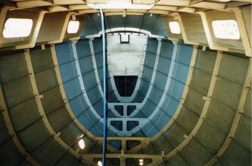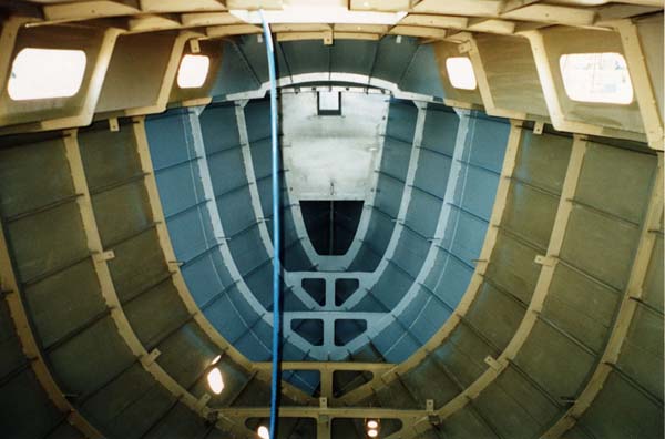 33. INTERIOR PAINTING—1 Above: this photo shows the forward part of the interior and the collision bulkhead / anchor locker plate. The removable plate that seals off the entire bow section is not fitted yet as painting and foaming has not been completed. The whole interior has already been sprayed with two-pack epoxy Sigma EP Universal Primer (khaki-green). Spraying of the second coat, blue two-pack epoxy Sigmacover TCP Coating, has commenced. After each coat has been sprayed, it is necessary to go around with a brush and paint all areas where the spray did not reach, for example, under all the stringers next to the frames. |