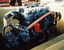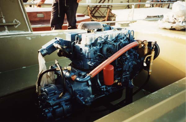 37. INSTALLING THE ENGINE Below: the Nissan-Diecon SD25 60 horsepower diesel engine sits in the cockpit ready for craning into the engine bay. |
