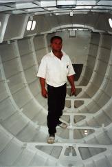After painting and before the foam insulation is blown in, all the frames and stringers are sealed to the plates with Sikaflex. This prevents any moisture from collecting and causing corrosion. Each stringer has a limber hole at one end, against a frame, and the lowest point of each frame in the bilge also has a limber hole. This, combined with the Sikaflex sealant, forces any water that does get inside the boat to flow along a stringer to its limber hole, then down through all the other stringer limber holes to the bilge, then through the bilge limber holes in the frames to the deep well where it collects and is pumped out by two electric bilge pumps. The job has been beautifully done and, combined with the high quality interior paintwork, should ensure that Masala is highly resistant to rusting from the inside out, a problem that is all too common in steel vessels. |