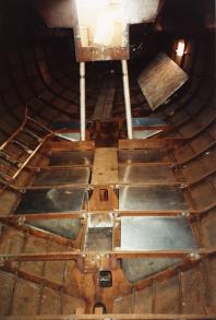34. INTERIOR PAINTING—2 Above: the third coat, white Sigmacover TCP Coating, is on. But the interior painting is not yet finished. After the foam insulation is sprayed in, the remaining exposed bilge area will be sprayed with a fourth coat, white Paracryl IFC, to give a glossier and easier to clean finish to the bilges. |