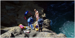 Weak moaning distracted me while photographing the deep ocean gulch at Frazer Blowhole on the Central Coast of NSW. I peered over the edge of the cliff and saw what looked like the dead body of a man lying unmoving on a rough rocky ledge just above breaking wave level. Only he wasn’t dead, as the moans testified, but he sure didn’t look in good shape. He and two mates had just jumped off a notorious cliff and plummeted perhaps 40m into the water, and in the process this guy injured himself and nearly drowned. MORE…
